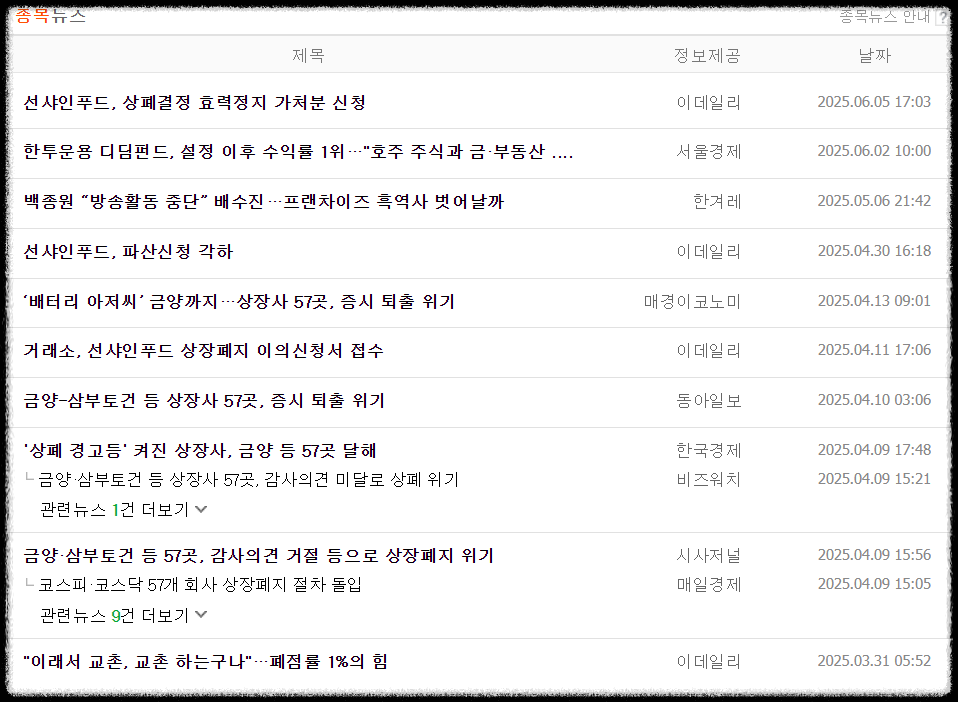 더불어 재무제표의 불확실성과 사업 전망 부재로 인해 M&A나 외부 투자 유치 가능성도 제한적입니다. 인수 의사를 보일 기업은 극히 소수에 불과하며, 인수 조건 또한 불리할 수밖에 없습니다. 따라서 선샤인푸드는 사실상 시장에서 퇴출 절차를 밟을 가능성이 큽니다.